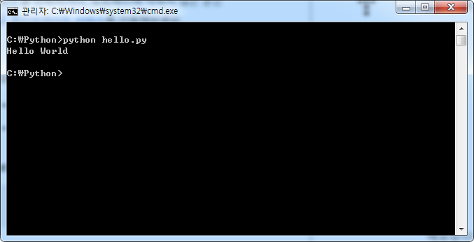 C:\Python 경로에서 python test.py 를 실행해서 아래와 같이 "Hello World" 가 표시되는 것을 확인한다.