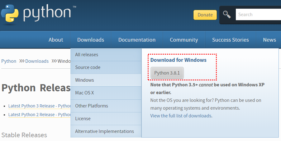https://www.python.org/ 에서 Windows 환경의 Python 설치 패키지를 설치한다.