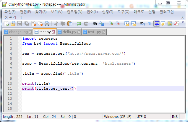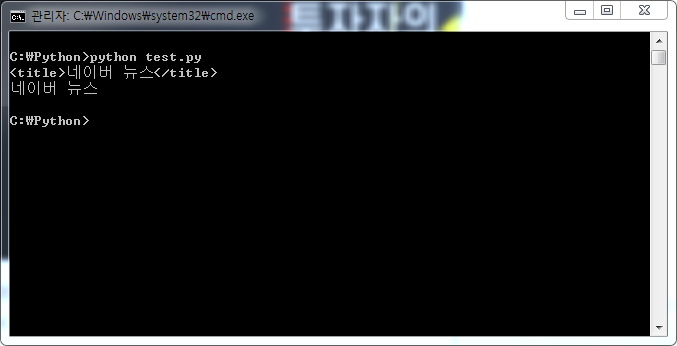 pip install BeautifulSoup이제 아래와 같이 requests 와 BeautifulSoup 라이브러리를 활용해서 웹 페이지를 읽은 후에 title 태그의 내용을 출력하는 예제를 출력해 본다. 이 예제는 news.naver.com 웹 페이지의 title 태그의 내용을 크롤링 하는 예제이다