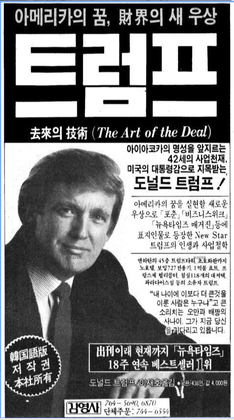 1988년 5월 15일자 한겨레 신문을 찾아보면, 당시에 트럼프가 출간한 베스트셀러 "거래의 기술(The Art of the Deal)" 의 신문 광고가 실려있다. 그런데 이 광고에서 트럼프를 "아이아코카의 명성을 앞지르는 42세의 사업천재, 미국의 대통령감으로 지목받는" 사람이라고 소개하고 있다.
