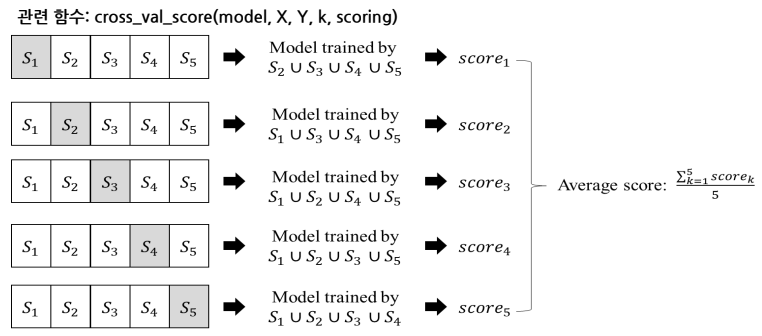 - 5등분해서 하나를 test 데이터(회색) 나머지(흰색)을 train 데이터로 사용.총 5번 반복