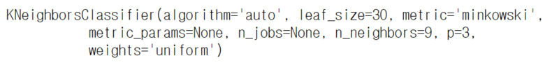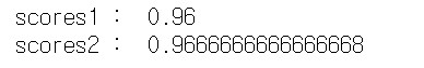 import seaborn as sns iris = sns.load_dataset('iris') X_iris = iris.drop('species', axis=1) y_iris = iris['species']# KNN 모델 인스턴스화 from sklearn.neighbors import KNeighborsClassifier model1 = KNeighborsClassifier(n_neighbors=1) model2 = KNeighborsClassifier(n_neighbors=3)# 5-겹 교차 검증 from sklearn.model_selection import cross_val_score scores1 = cross_val_score(model1, X_iris, y_iris, cv=5, scoring = 'accuracy') scores2 = cross_val_score(model2, X_iris, y_iris, cv=5, scoring = 'accuracy') print('scores1 : ', scores1.mean()) print('scores2 : ', scores2.mean())
