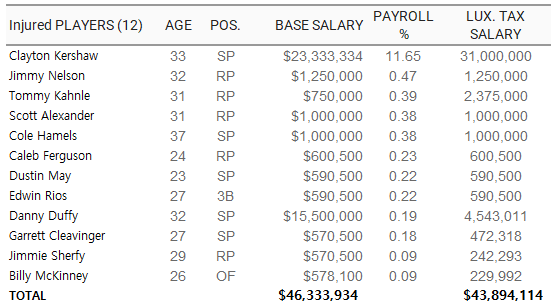 부상자 명단의 선수들 연봉 (4천 4백만 달러)