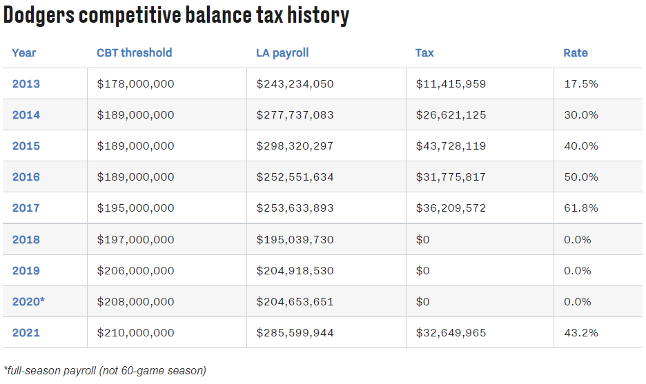 하지만 2021년에 무키 베츠, 트레버 바우어, 맥스 슈어저와 같은 대형 계약을 체결하면서 사치세 기준 210M$ 을 훌쩍 초과하는 팀 연봉 $295M 을 기록하면서 4년만에 다시 사치세를 내는 상황이 됩니다.