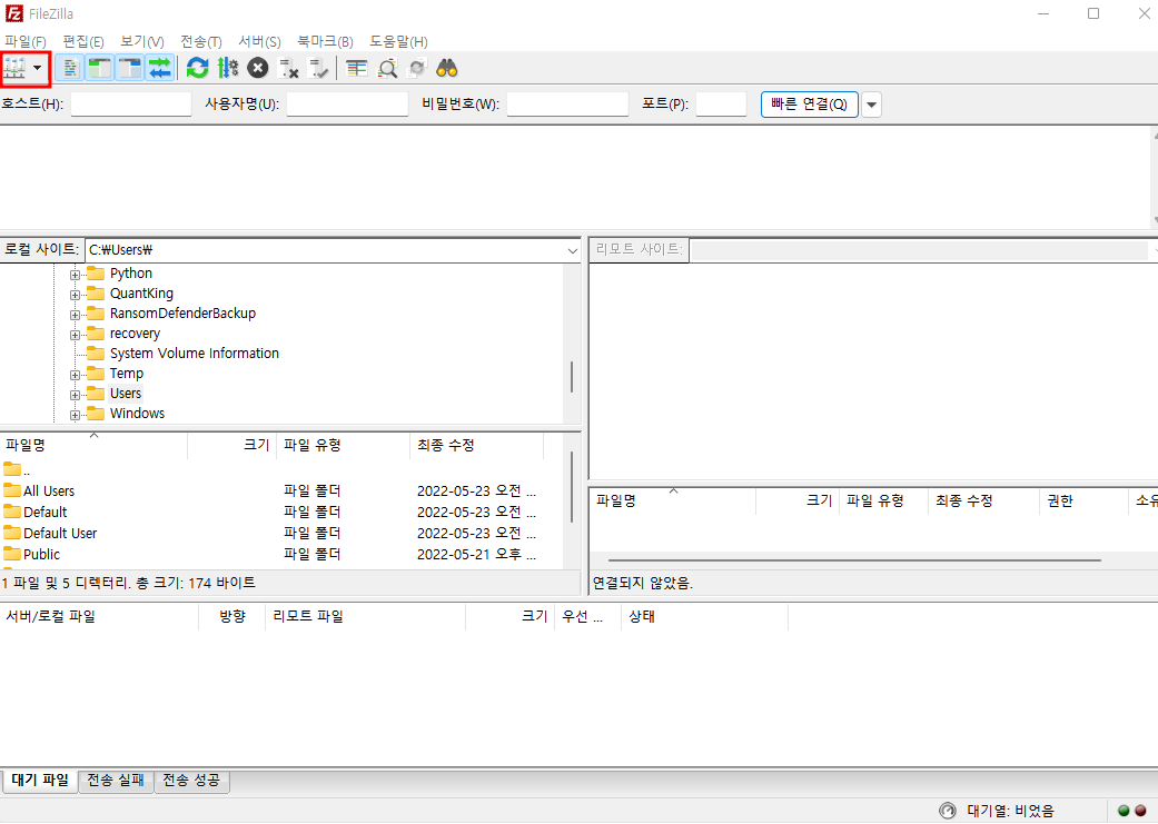 FileZilla Client 를 설치하면 아래와 같은 화면을 볼 수 있습니다.