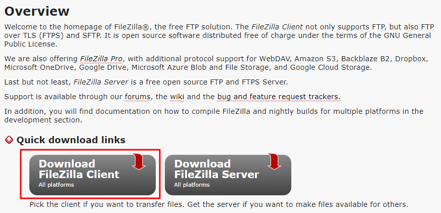 Overview Welcome to the homepage of FileZilla®, the free FTP solution. The FileZilla Client not only supports FTP, but also FTP over TLS (FTPS) and SFTP. It is open source software distributed free of charge under the terms of the GNU General Public Licen