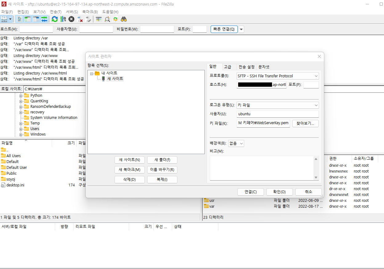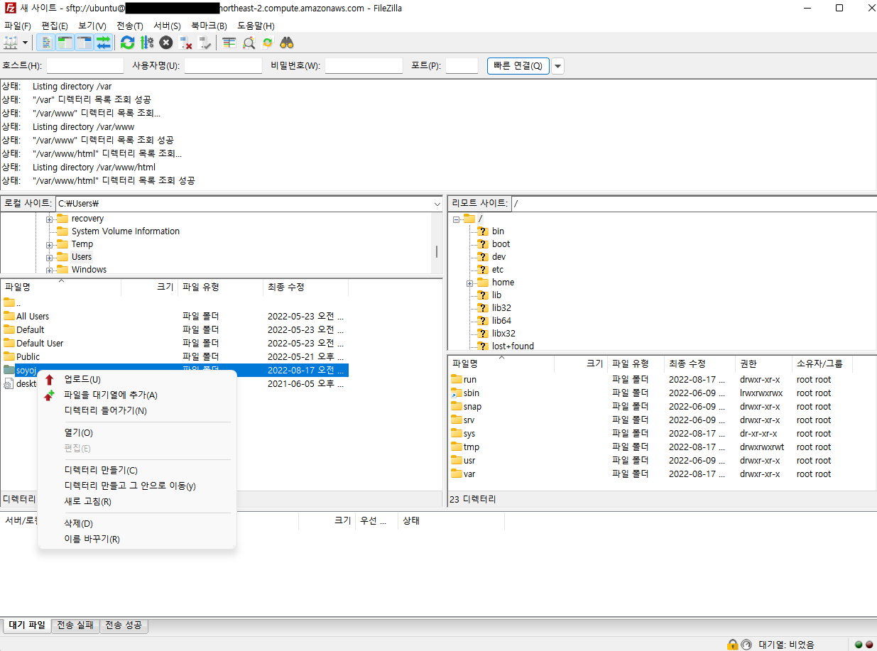 이제 아래와 같이 정상적으로 잘 접속되는 것을 확인할 수 있습니다. 왼쪽이 내 로컬 컴퓨터, 오른쪽이 EC2 서버의 디렉토리가 보이며, 업로드 할 파일을 선택해서 우클릭하면 "업로드" 라고 메뉴가 표시됩니다. 이 메뉴를 이용해서 파일은 전송할 수 있습니다. EC2 에서 로컬 컴퓨터로 다운로드 받을 때는 "다운로드" 가 됩니다.
