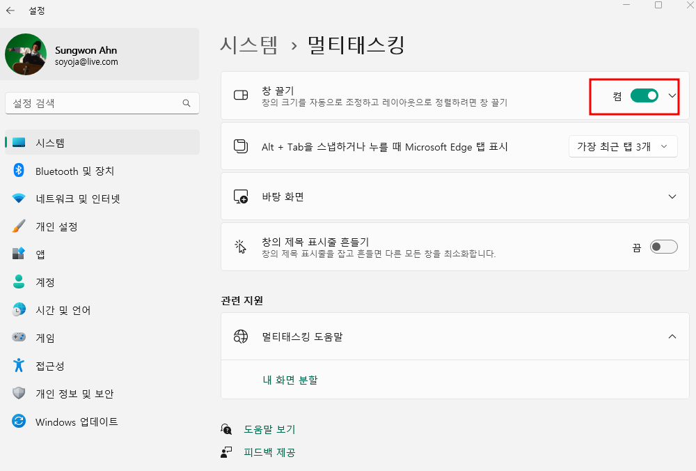 Windows 11 의 화면나누기 기능 비활성화IT/Windows 2022. 10. 6. 12:58